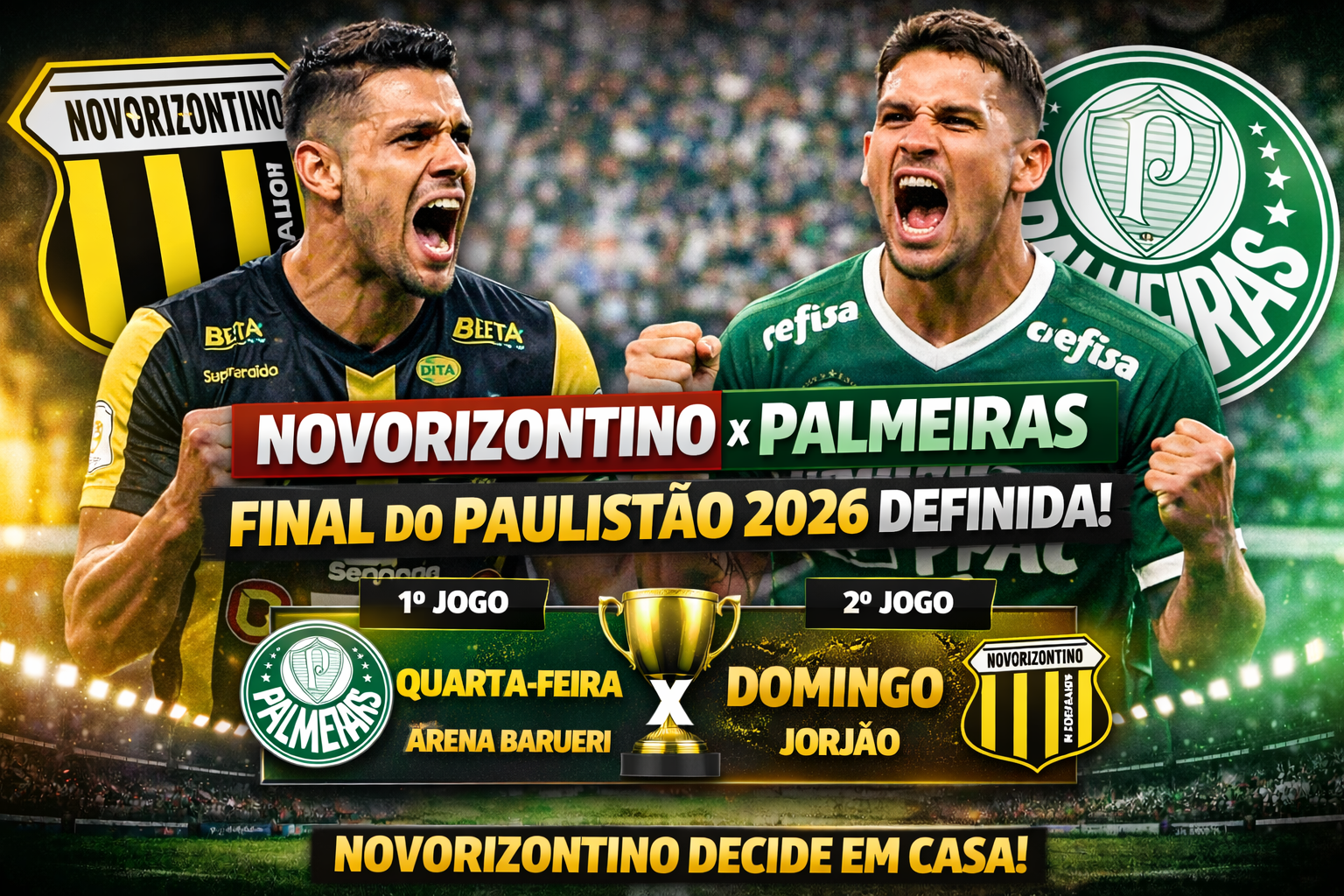 A grande decisão do Campeonato Paulista 2026 já tem ordem definida e promete equilíbrio absoluto entre Novorizontino e Palmeiras. O primeiro confronto terá mando do Verdão, enquanto a partida decisiva será disputada no estádio Jorge Ismael de Biasi, o Jorjão, em Novo Horizonte. A definição ocorreu com base na campanha acumulada ao longo da competição.