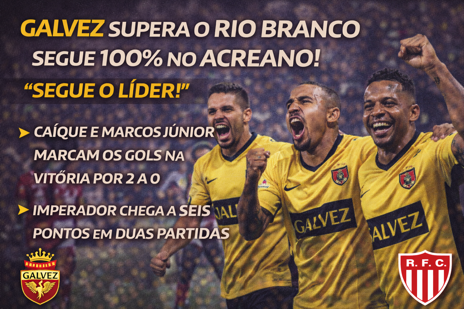 O Galvez confirmou o bom início de temporada e derrotou o Rio Branco-AC por 2 a 0, na noite desta quinta-feira, na Arena da Floresta, em Rio Branco, pela segunda rodada do Campeonato Acreano Série A. Os gols saíram apenas no segundo tempo, com Caíque abrindo o placar logo aos quatro minutos e Marcos Júnior fechando a conta nos acréscimos, aos 53, após um contra-ataque fatal.