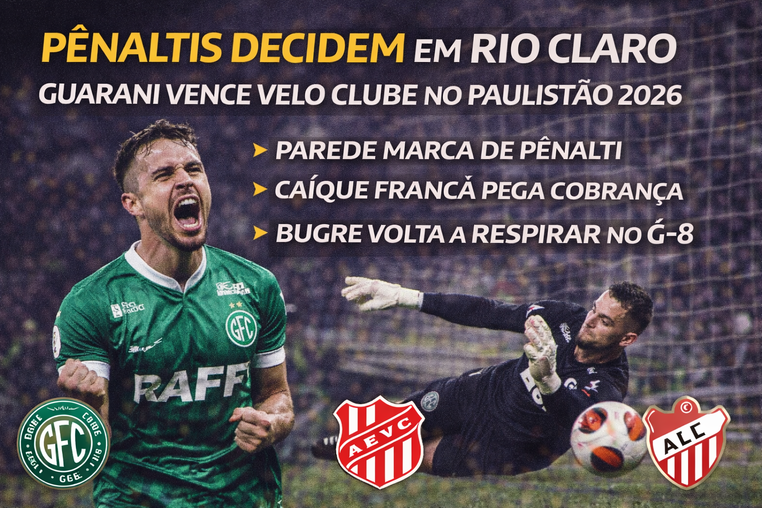 O duelo entre Velo Clube e Guarani, disputado em Rio Claro pelo Campeonato Paulista 2026, foi marcado por tensão, equilíbrio e, sobretudo, por cobranças decisivas na marca da cal. Enquanto o Bugre converteu sua oportunidade ainda no primeiro tempo com Guilherme Parede, os donos da casa desperdiçaram a chance do empate na etapa final após grande defesa de Caíque França. Assim, o placar de 1 a 0 foi confirmado e três pontos importantes foram somados pela equipe campineira.