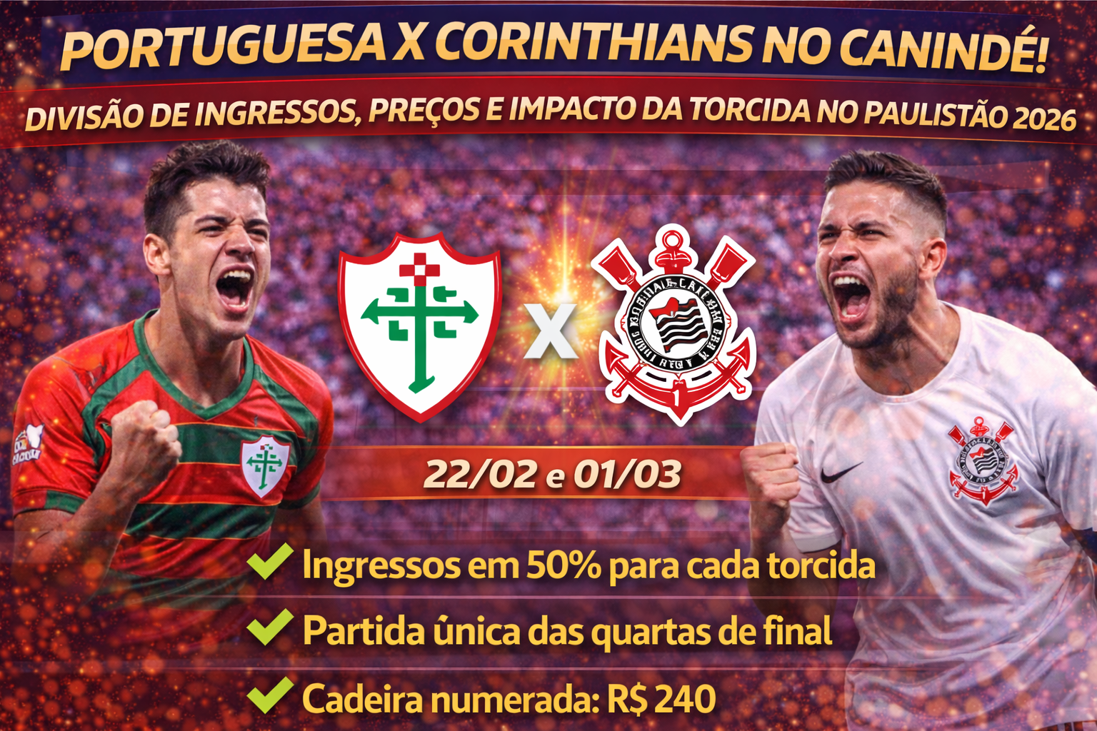 O confronto entre Portuguesa e Corinthians pelas quartas de final do Campeonato Paulista 2026 promete um dos ambientes mais intensos da temporada. A partida será disputada no Estádio do Canindé, no próximo domingo, às 20h30, e terá divisão equilibrada de ingressos entre as torcidas, algo que aumenta ainda mais a expectativa para um duelo decisivo em jogo único.